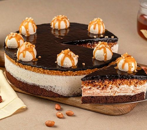 Шоколадный бисквит с карамельным кремом и мягким грильяжем из арахиса