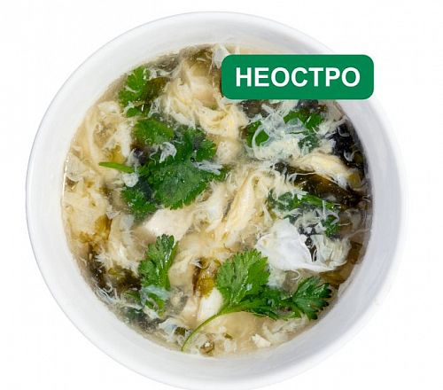 Совсем не остро. Сыр тофу, водоросли морские, специи, крахмал кукурузный, бульон куриный, яйцо куриное