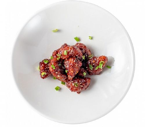 Блюдо островатое, по шкале остроты - один перец из трех. Куриное филе, панировочные сухари, мука темпурная, яйцо куриное, соевый соус, белый перец, зеленый лук, кунжут, кетчуп томатный, уксус рисовый, сахар, мед, чеснок, паста соевая острая