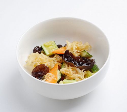 Блюдо островатое, по шкале остроты - один перец из трех. Огурцы, соус понзу (бульон мясной, масло растительное, соус соевый креветочный, уксус 9%, сахар) грибы древесные муэр, морковь, чеснок, перец чили, арахис, лук зеленый, кинза