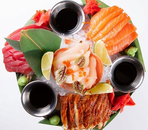 Сашими из лосося, тунца, сахалинского гребешка, копченый угорь, лайм, соус соевый , васаби и имбирь