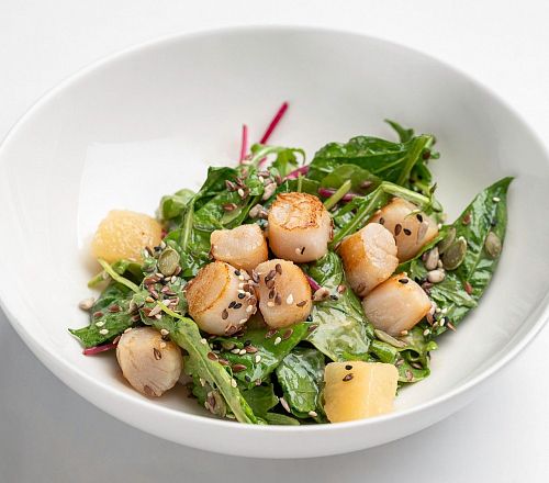 Гребешок морской, груша в карамели, соус мисо дрессинг, сыр страчателла, шпинат свежий, руккола, салат мангольд, микс злаков