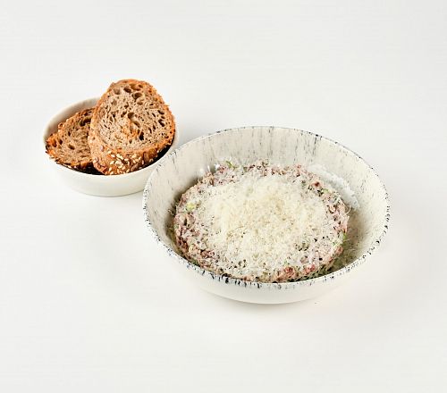 Телятина, лук красный, соус тар-тар, сыр пармезан, петрушка, хлеб.