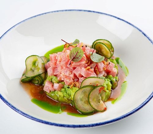 Тар-тар из тунца в соусе кимчи-майо, на подушке из гуакамоле из авокадо и огурца, конкасе из помидоров, и огурцы маринованные в кимчи