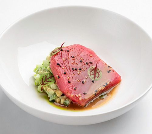 Острое блюдо из филе тунца на подушке из рубленого авокадо с огурцом под соусом на основе имбиря, чеснока, кунжута и креветочного соевого соуса