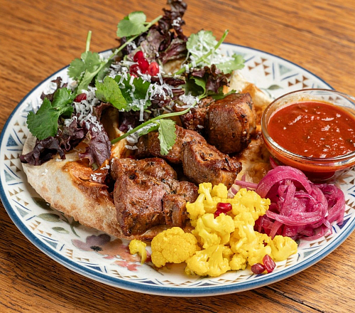 Свинина, салат лолла росса, масло оливковое, сыр фета, гранат, лук красный, аджика, кинза, томатная паста, петрушка, укроп, уксус винный, масло растительное, базилик, лук репчатый, соль, перец, паприка, орегано, смесь специй для шашлыка