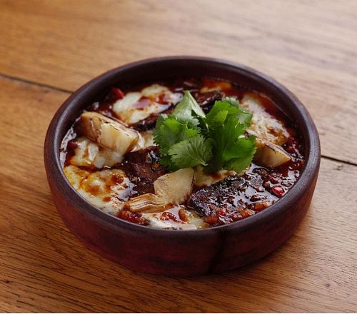 Горячее блюдо из говяжьих щечек с добавлением болгарского перца, моркови, репчатого лука, артишоков, тархуна, чеснока, соусов наршараб и томатной пасты, а так же сыров - сулугуни и имеретинский