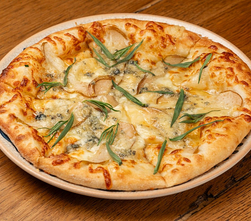 Оригинальный закрытый хачапури с сырами сулугуни и имеретинский, сметаной и сливочным маслом внутри. Сверху выкладываем свежую грушу, сыр Дор Блю, имеретинский сыр. Украшаем свежим тархуном и медом.
