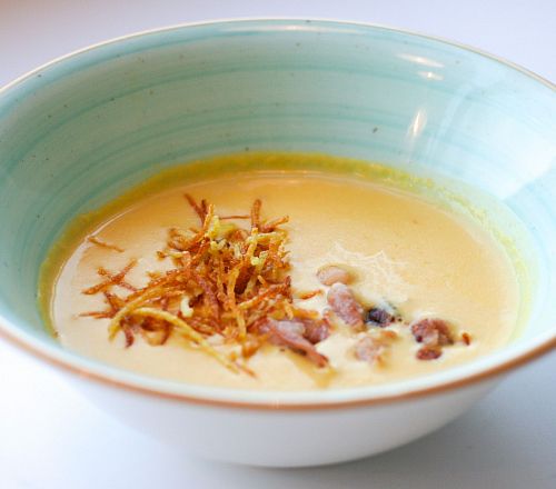 Крем-суп приготовленный на молоке из картофеля, лука, моркови. украшается петрушкой.