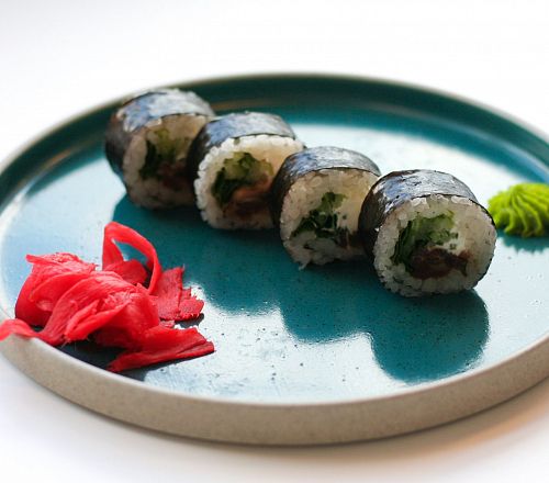 Нори, рис, ростбиф, огурец, сливочный сыр, зеленый лук