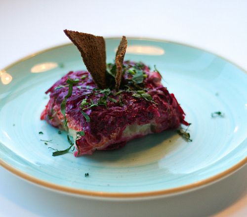 Традиционный салат из картофеля, лука, моркови, сельди. Заправляется майонезом, подается с тостами из бородинского хлеба и украшается петрушкой