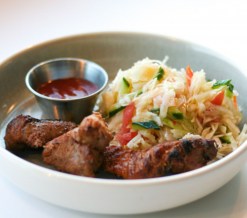 Шея свиная, маринад, соус сацебели, капуста, томат, огурец, специи