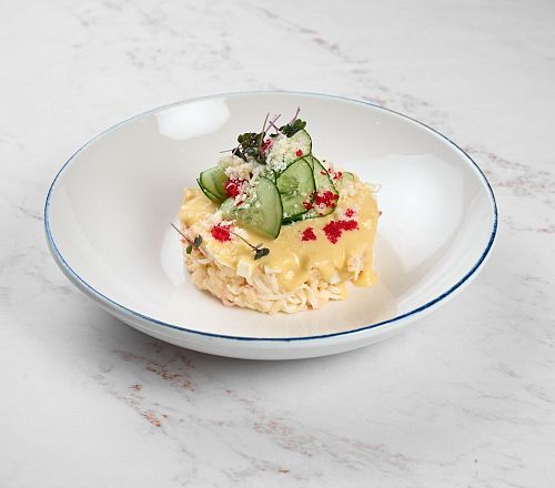 Мы решили переиграть классику новогоднего стола и приготовить крабовый салат в непривычной подаче с пюре из молодой кукурузы.