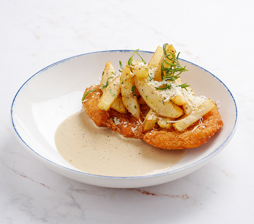 Куриный шницель с картофелем фрай со специями, чесночным маслом, пармезаном и розмарином