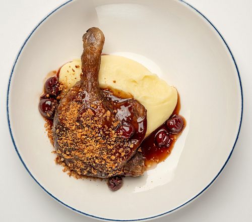 Нежное мясо, томленное с чесноком и пряностями. Подается на подушке из воздушного картофельного пюре со шпинатом и дробленым миндалем. Хрустящую ножку идеально дополняют два соуса — вишневый и гранатовый