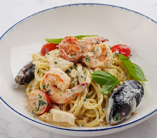 Лингвини с морепродуктами в сливочном соусе с томатами черри