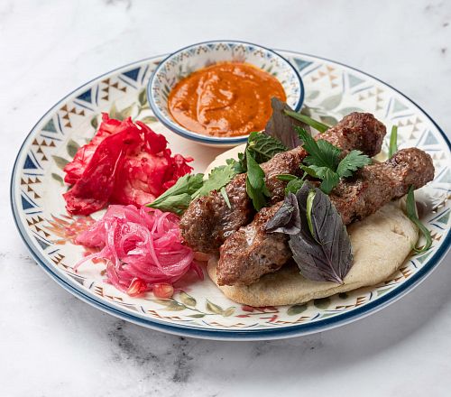 Жарится на углях, подается с лепешкой из печи, соусом сацебели, маринованным луком и гурийской капустой (маринованная капуста), миксом зелени и гранатом