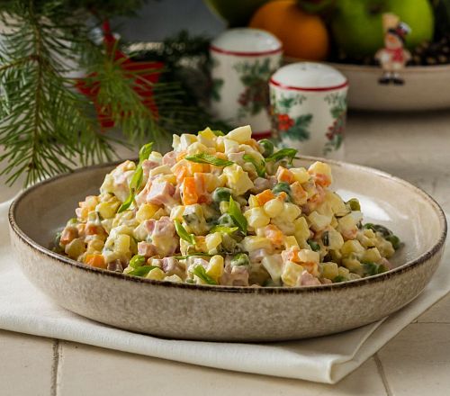 Классический оливье из отварного картофеля, моркови, куриных яиц, консервированных огурцов, ветчины и свежего зеленого горошка. Заправляется сметаной, майонезом и зеленым луком