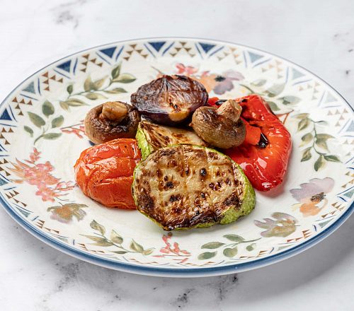 Свежие овощи и грибы маринуем с солью и ароматным маслом, обжариваем на гриле