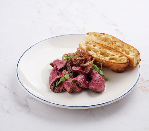 Маринованная говяжья вырезка с красным луком, подается с хрустящим лавашом