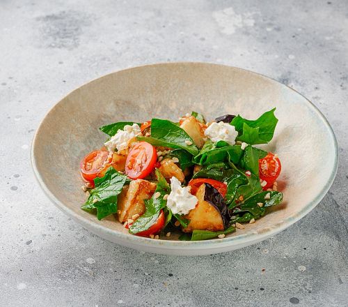 Салат с хрустящими баклажанами, шпинатом, томатами Черри, арахисом и соусом Чили понзу